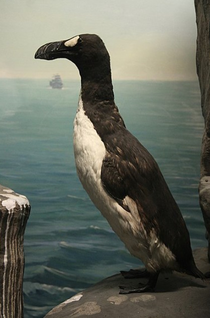 The great auk spent a lot of time in the water, coming ashore just to breed. They stood out from penguins which made it easy for hunters who killed them for their meat and feathers.